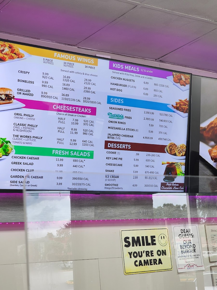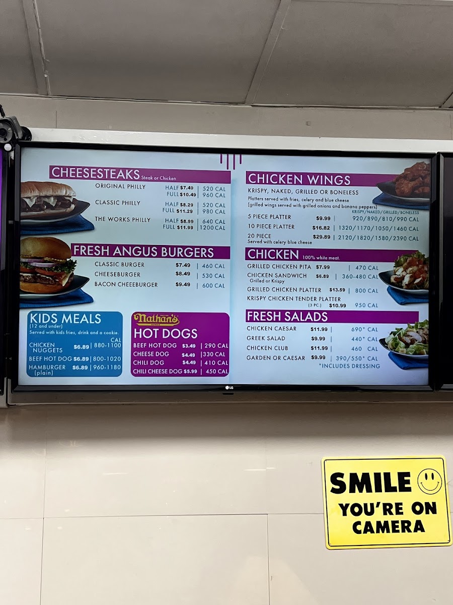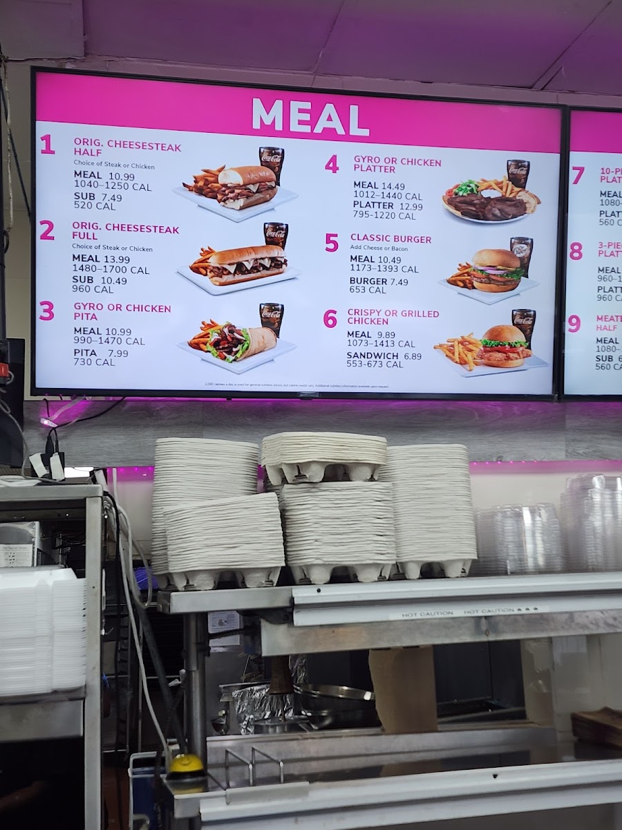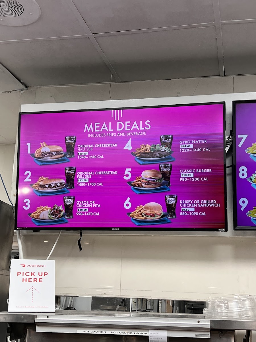 Chicken cheesesteak with grilled onions, melted Swiss American cheese, a side and a drink Calories 1040-1250